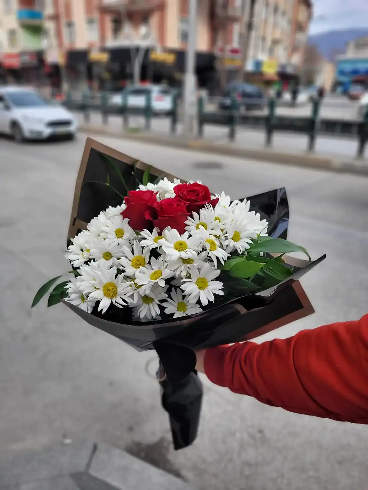Zarif ve şık bir kombinasyon sunan bu buket, 3 adet canlı gül ile papatyaların uyumlu birlikteliğinden oluşur. Siyah kağıt ambalajıyla modern ve çarpıcı bir sunum sağlar. Küçük ama anlamlı hediyeler için ideal bir tercihtir.