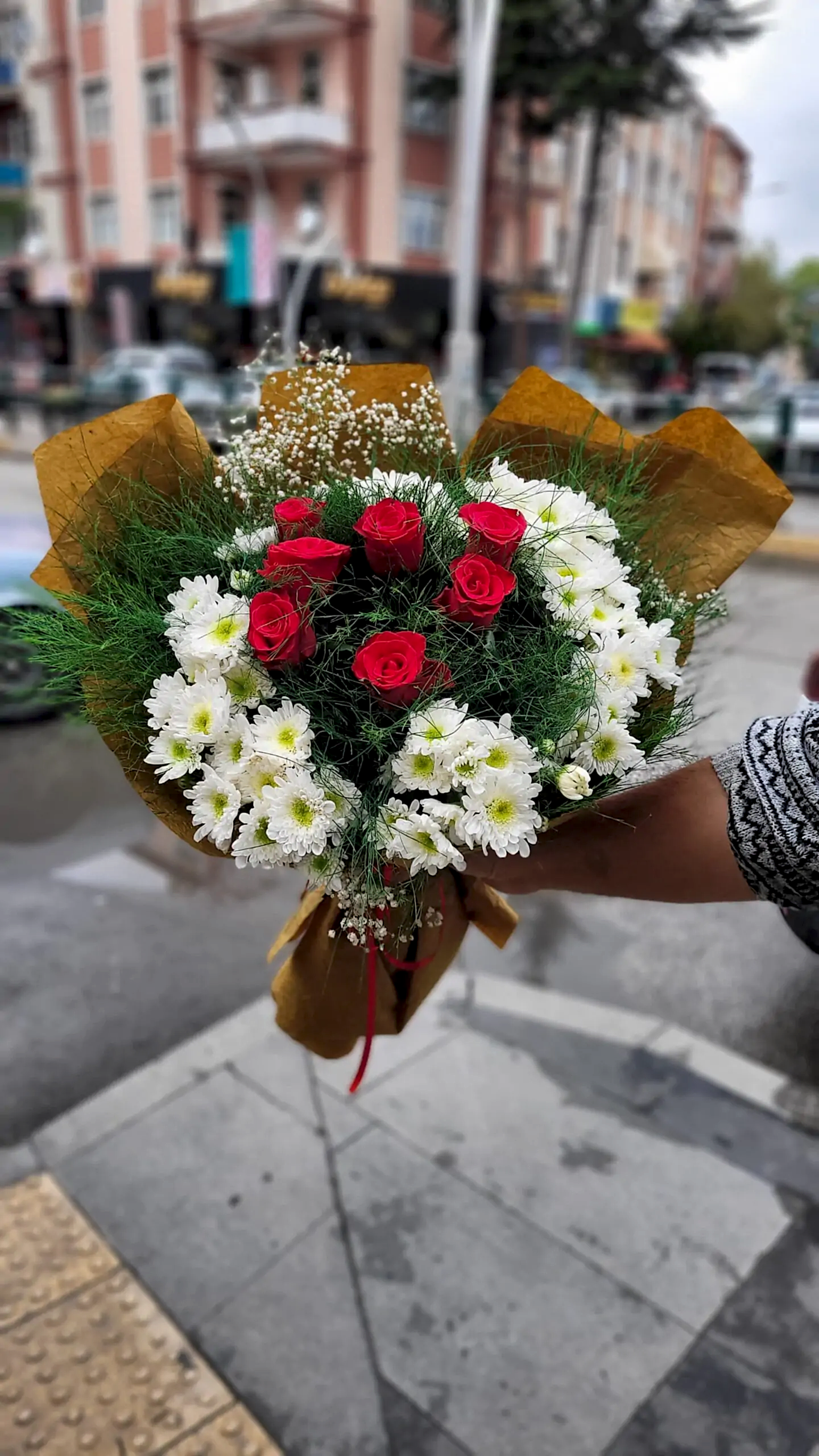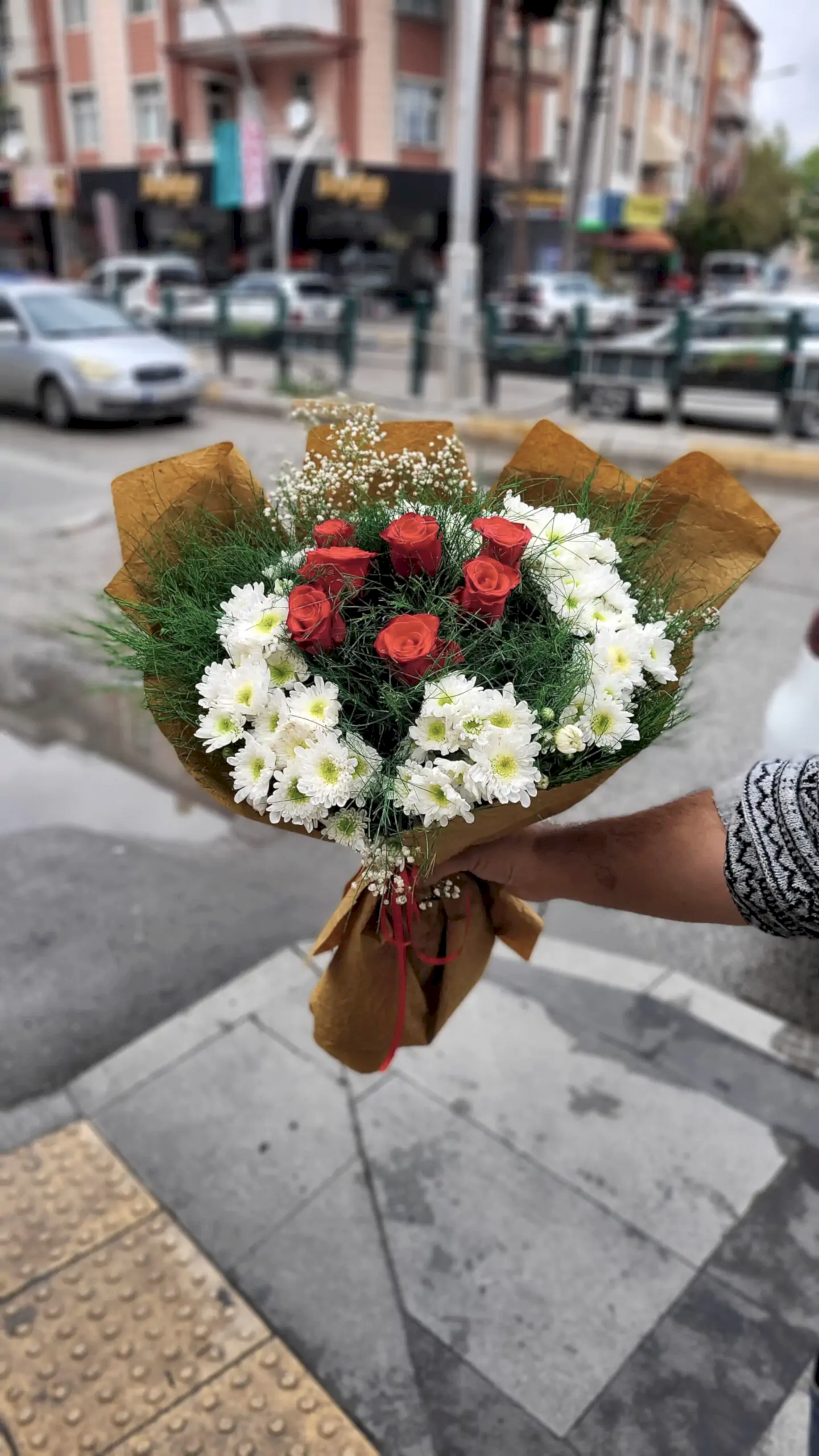 Doğallığın ve romantizmin kusursuz uyumunu yansıtan bu buket, 7 adet taptaze kırmızı gül ve papatyanın zarif birlikteliğiyle hazırlanır. Naturel kraft kâğıt ile sade ama etkileyici bir sunuma sahiptir. Sevginizi ve içtenliğinizi göstermek için ideal bir tercihtir.