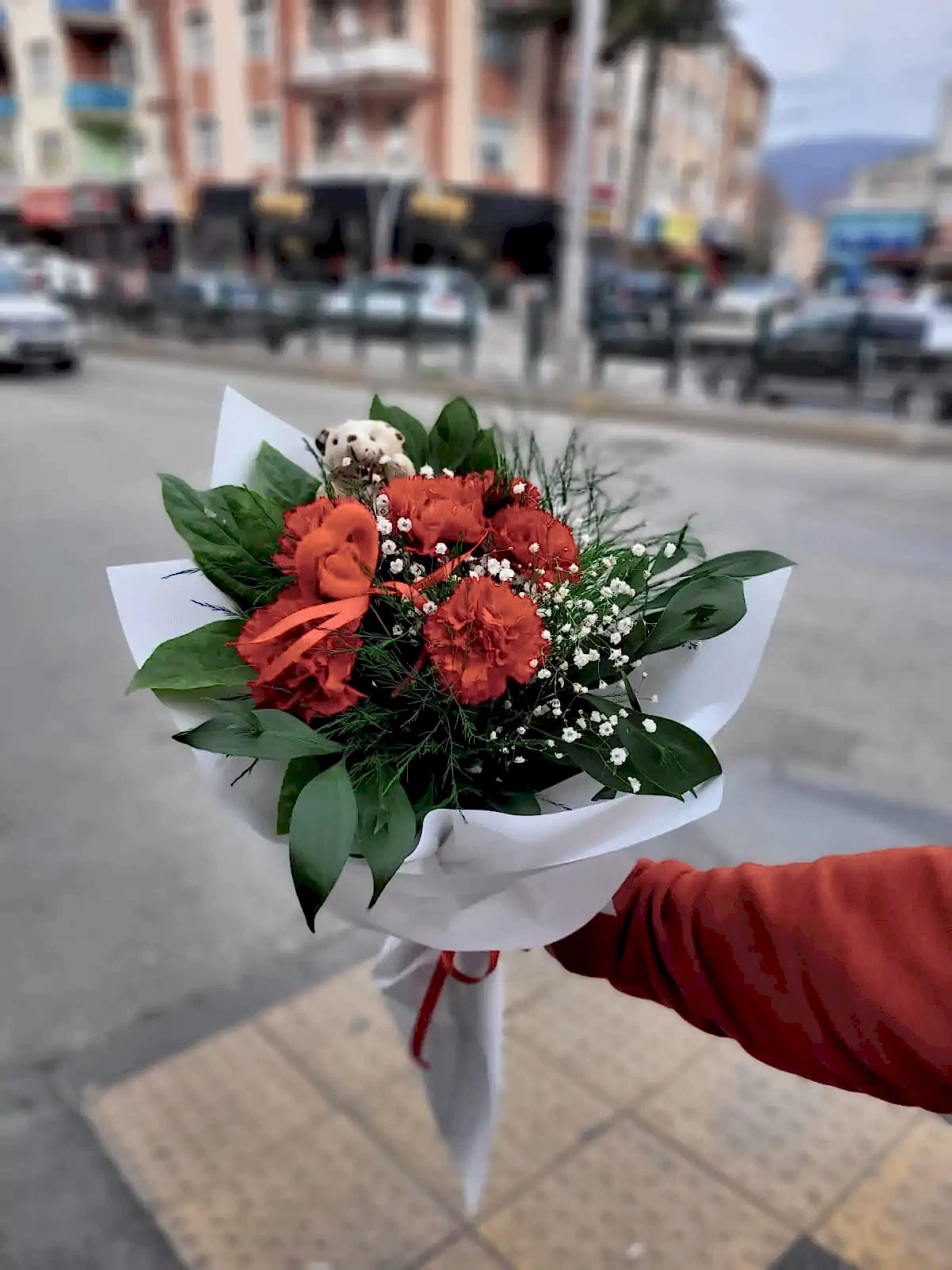 Saf beyaz karanfillerden oluşan 6’lı buket, yanında sevimli ayıcık hediyesiyle duygularınızı en tatlı şekilde ifade eder. Zarif ve samimi tasarımıyla özel anlara neşe katar.