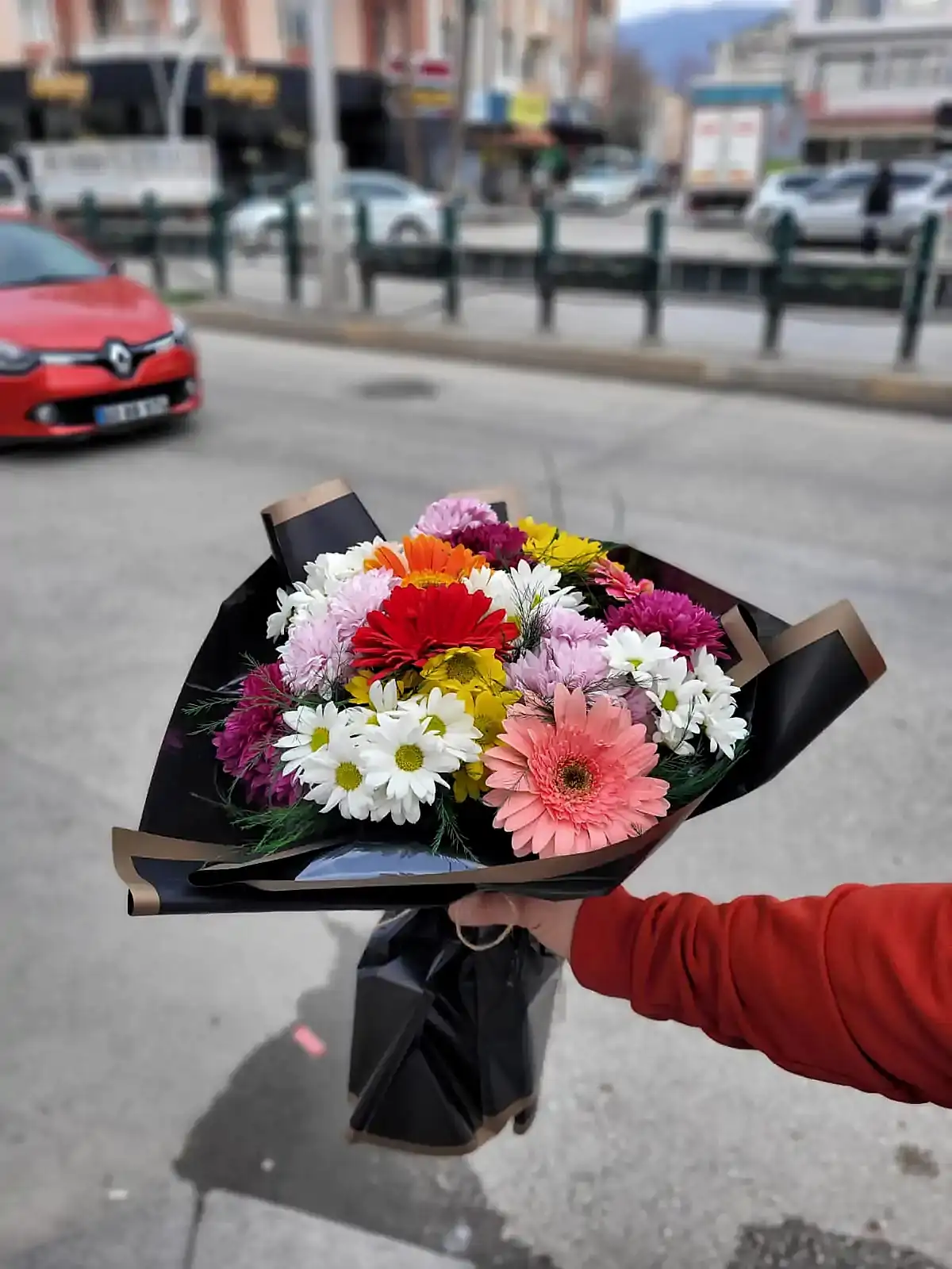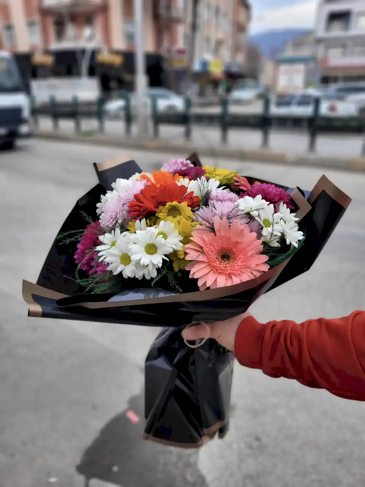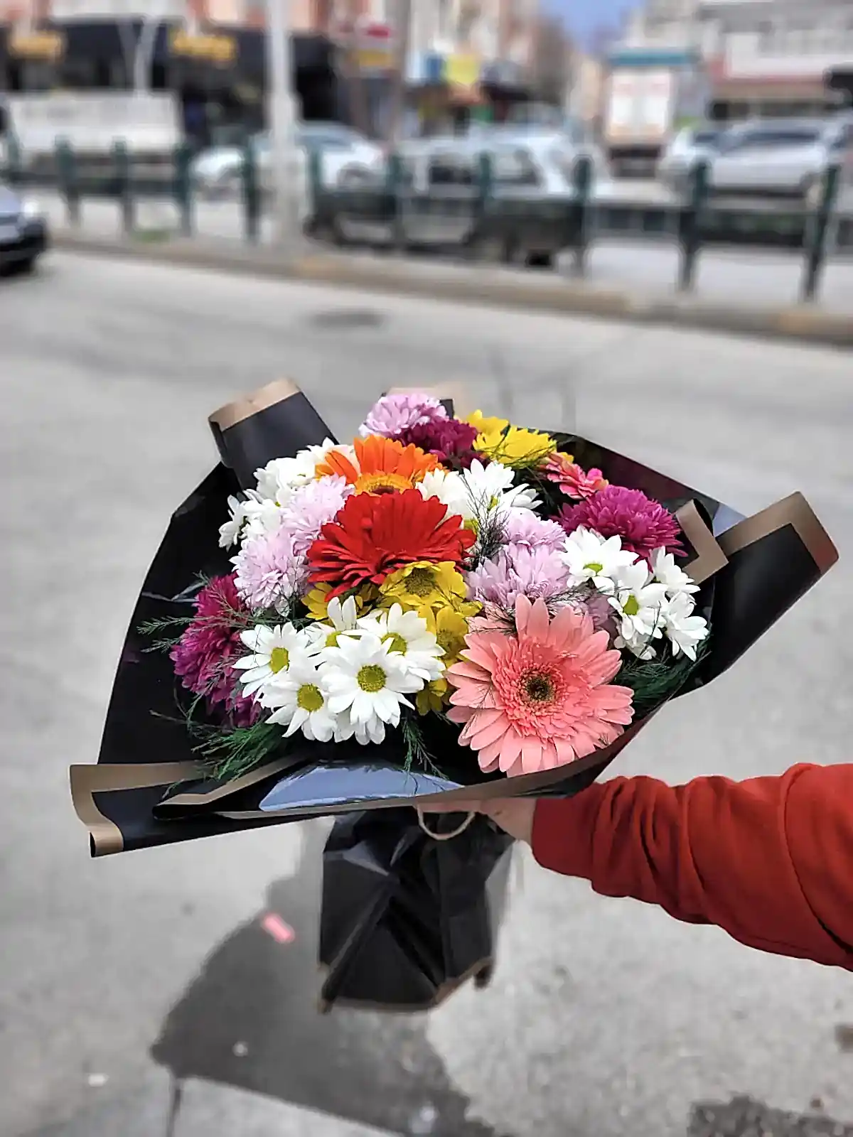Farklı mevsim çiçeklerinin bir araya gelmesiyle hazırlanan bu özel buket, siyah kâğıt ambalajı sayesinde hem modern hem de çarpıcı bir görünüm sunar. Renklerin ve kokuların uyumuyla tasarlanan bu buket, her zevke hitap eden zarif bir sürprizdir.