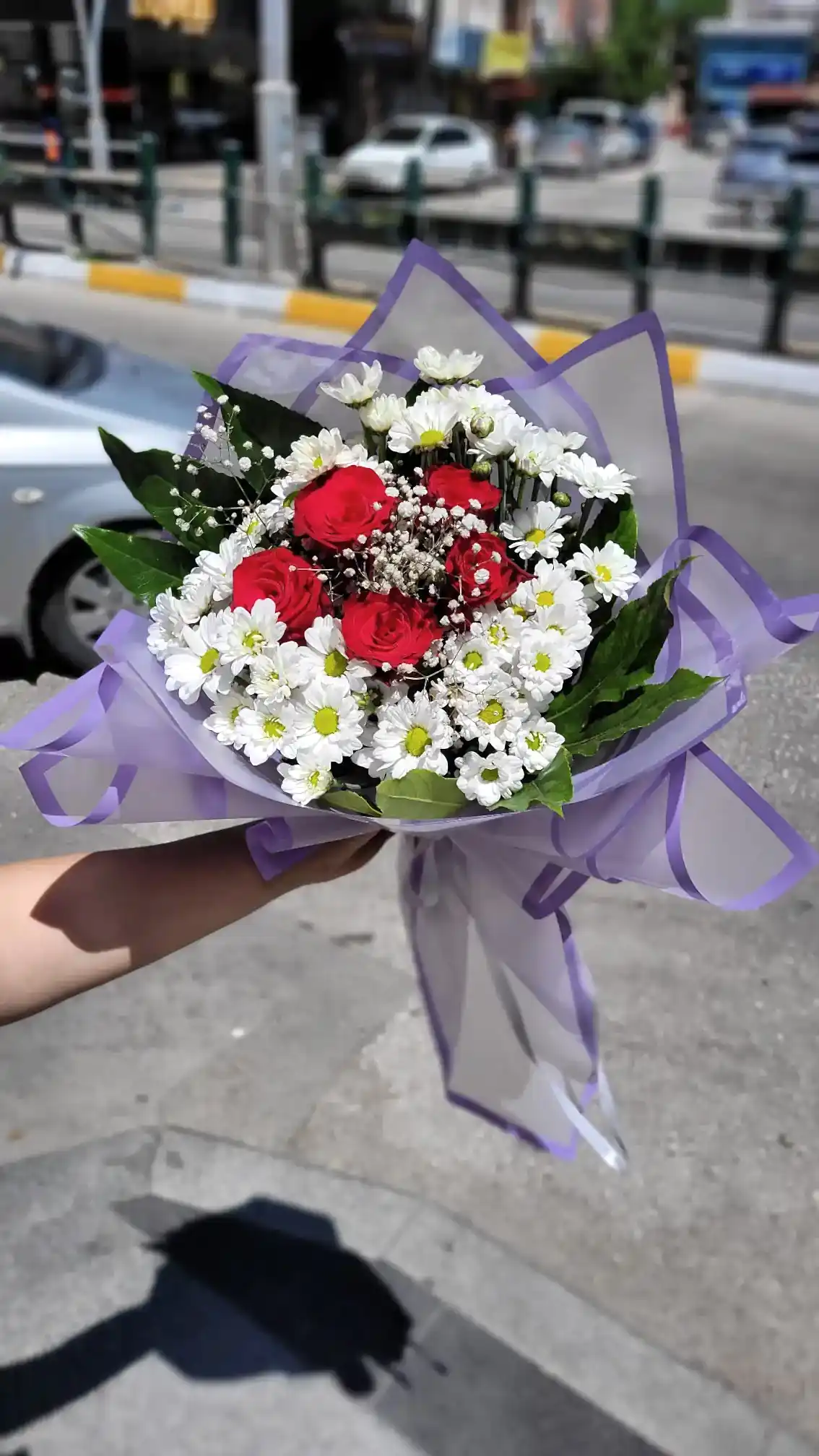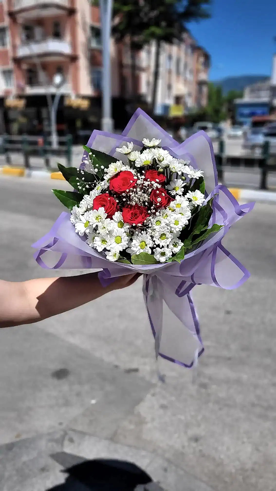 Beyaz papatyalarla çevrili kırmızı güller, estetik ve göz alıcı bir kontrast oluşturur. Buket, doğal kraft kağıt veya isteğe göre farklı ambalaj seçenekleriyle sunulur.