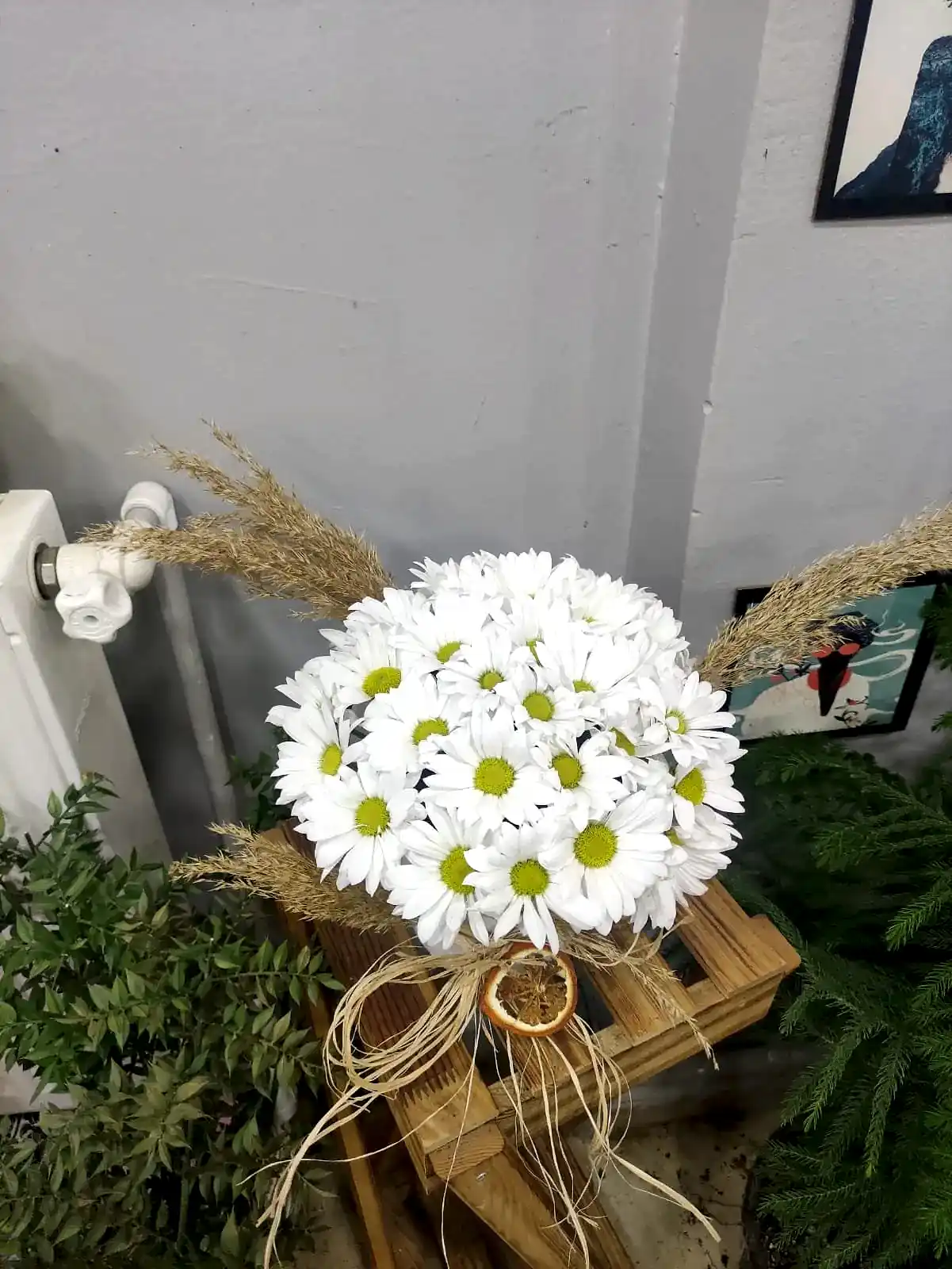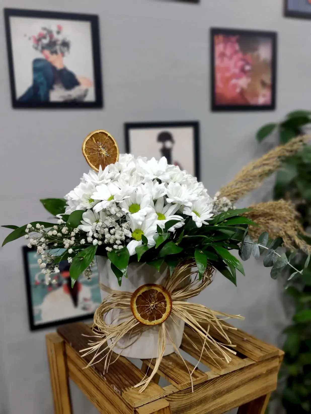 Taze papatyaların şık seramik vazoda sunulduğu bu tasarım, doğal güzellik ile modern zarafeti bir araya getirir. Ev ve ofis dekorasyonlarına ferah bir dokunuş katmak için ideal.
