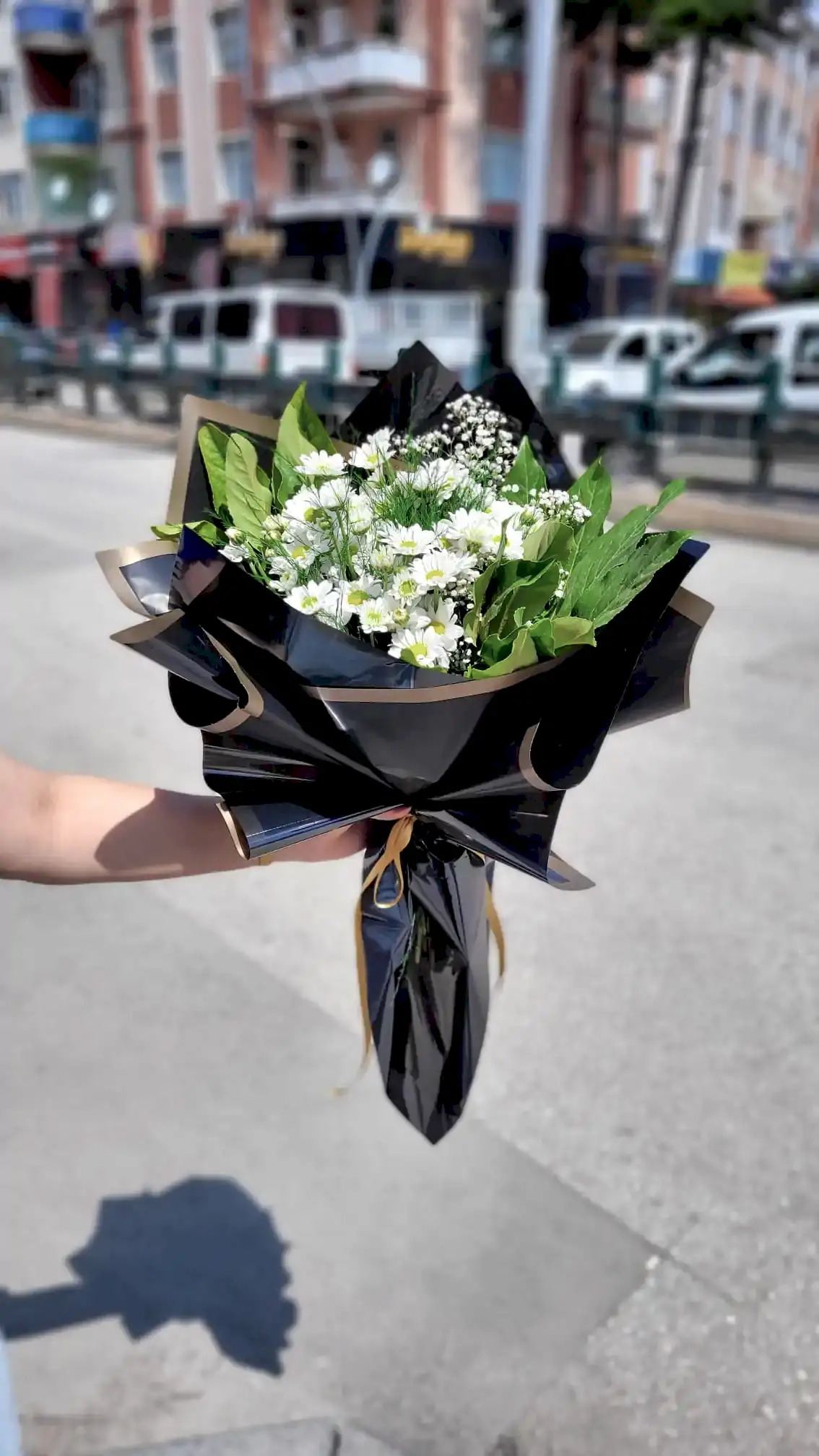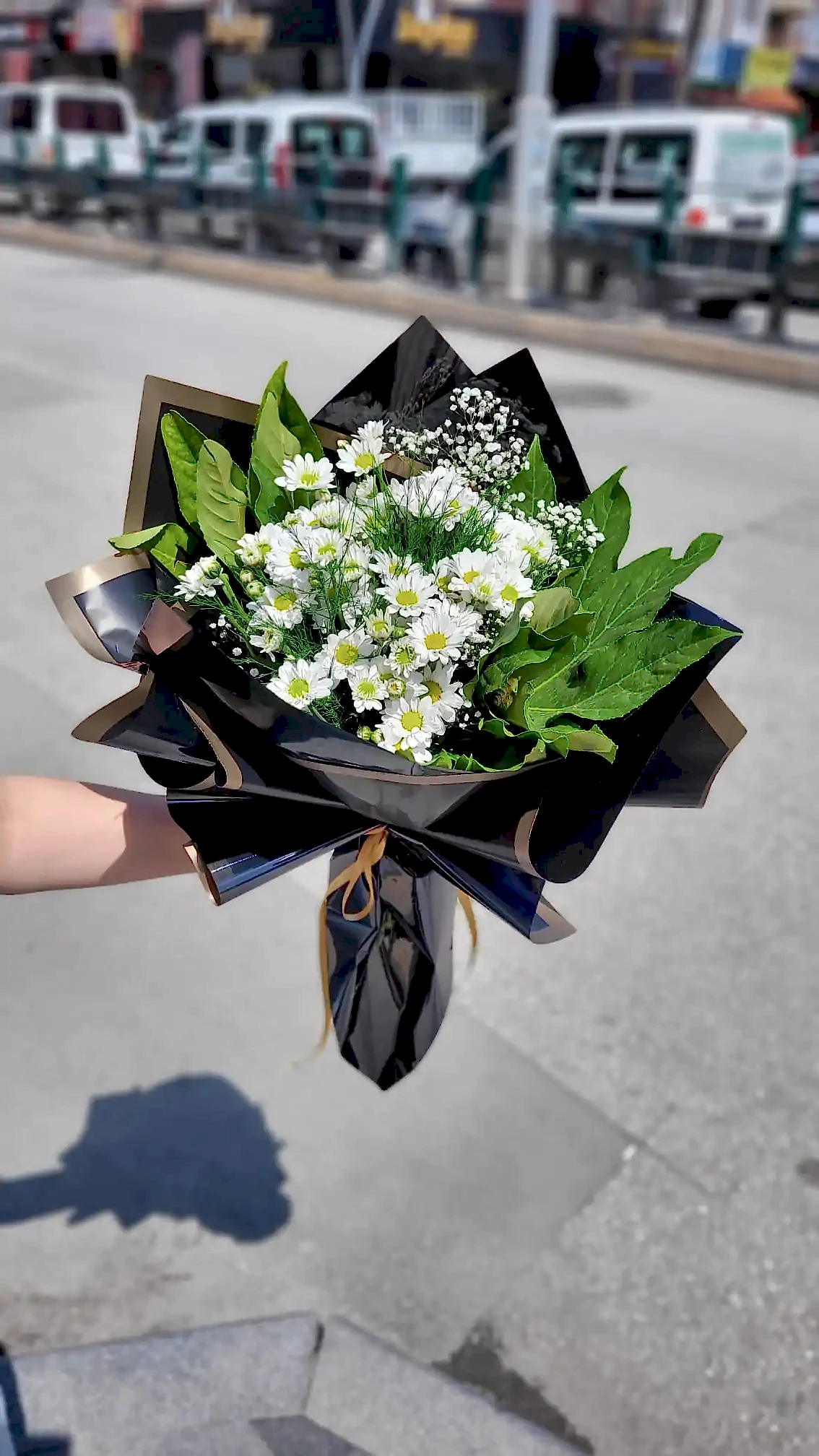 aflığın ve zarafetin simgesi beyaz papatyalar, siyah buket kağıdı ile modern ve çarpıcı bir sunum kazanıyor. Bu kontrastlı tasarım, her ortama uyum sağlayan şık ve anlamlı bir hediye seçeneğidir.