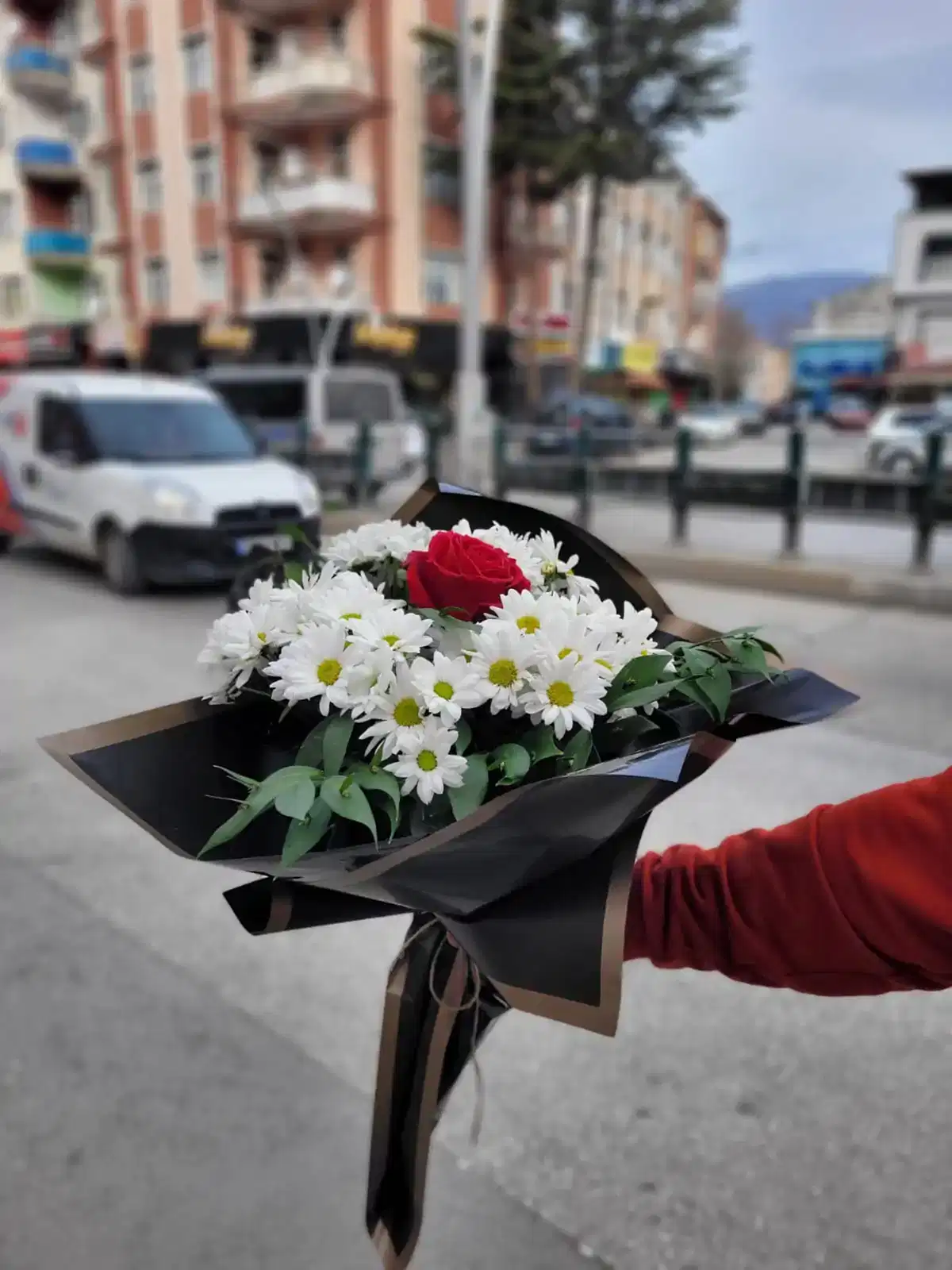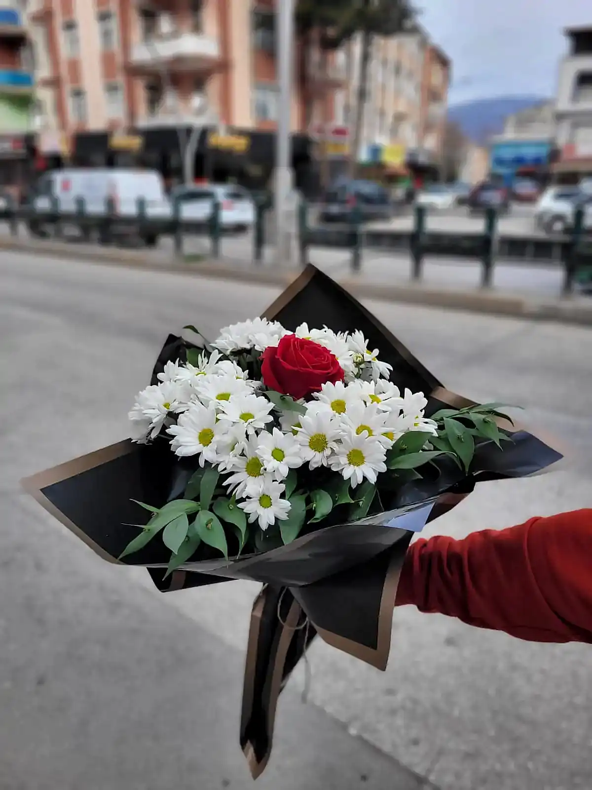 Zarafetin ve sadeliğin buluştuğu bu bukette, tek bir taze gül ile papatyalar bir araya geliyor. Siyah kraft kâğıtla sarılarak modern ve etkileyici bir sunum sağlanır. Küçük ama anlamlı bir hediye seçeneğidir.